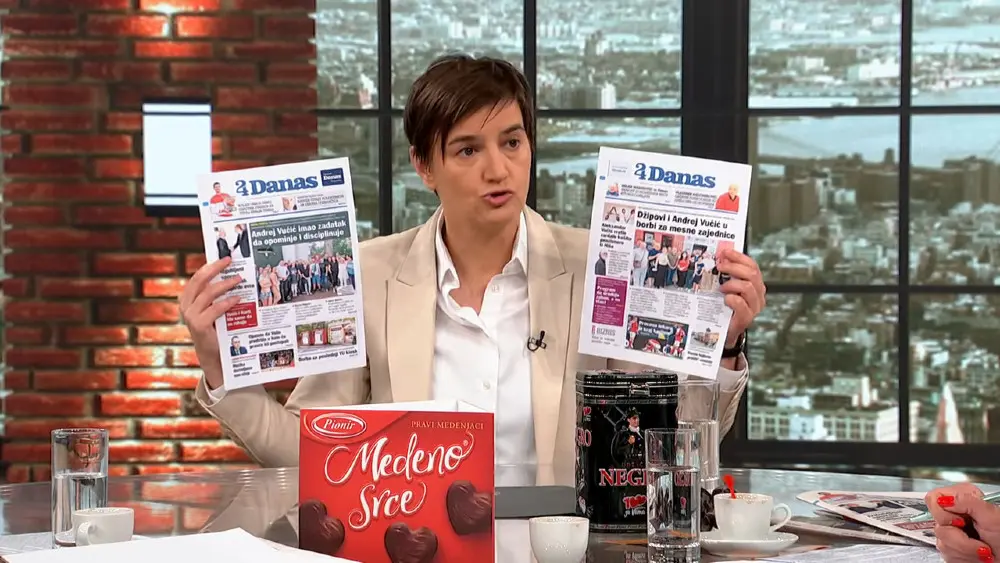 Premijerka Srbija Ana Brnabić gostujući u emisiji Hit tvit pokazala je naslovne strane opozicionog medija „Danas“ na kojima je u većini slučajeva predsednik Aleksandar Vučić.