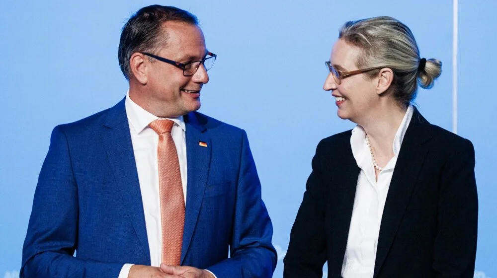 foto: EPA-EFE/CLEMENS BILANLideri stranke i poslaničkog kluba AfD-a u Bundestagu su Alis Vajdel (44) i Tino Krupala (48). U Bavarskoj se u nedelju 8. oktobra održavaju pokrajinski izbori i u toku su završne manifestacije u okviru izborne kampanje.