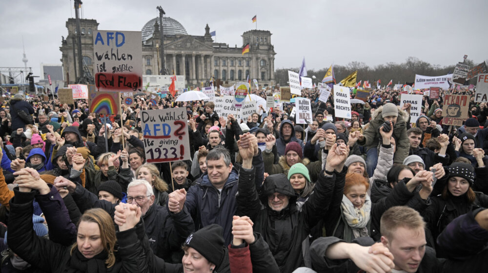 Foto: AP Photo/Ebrahim NorooziOko 150.000 ljudi okupilo se danas u centru Berlina, ispred Rajhstaga i uzvikivalo antifašističke parole uperene protiv ekstremne desnice.