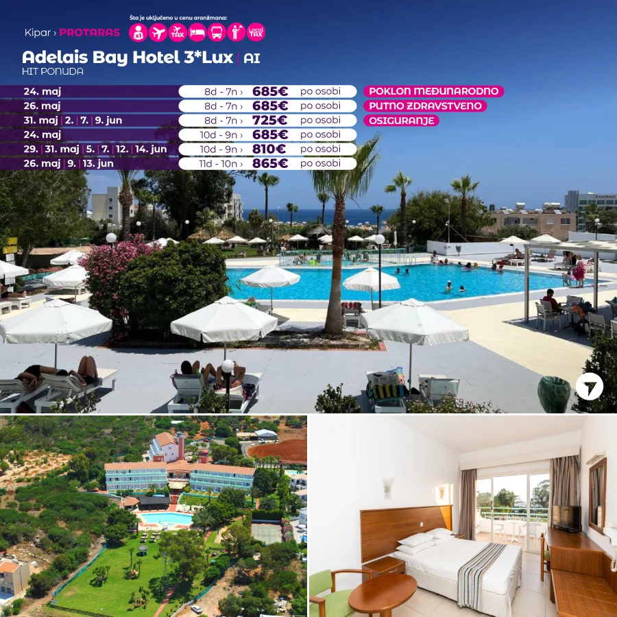 Odličan hotel, lociran nedaleko od centra Protarasa, na najlepšem delu dugačke peščane plaže. Od sadržaja hotel ima restoran, bar, spoljašnji bazen, dečiji bazen, teniski teren, teretanu, animaciju tokom dana i večeri, muzički program. Sve sobe su klimatizovane, imaju TV, fen, telefon, a uz doplatu mogu se koristiti frižider, sef i wi-fi internet.