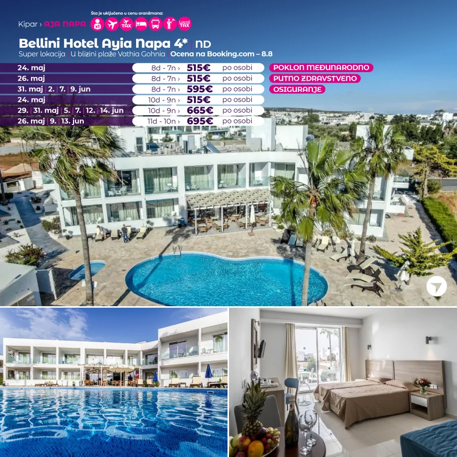Potpuno renoviran hotel Bellini Ayia Napa je smešten u Aveniji Nisi (Nissi Avenue), u srcu Aja Nape (Ayia Napa). U ponudi ima izvanredno uređene apartmane. Osim toga, nudi studije i suite jedinice koje se nalaze oko privatnog bazena, bara i restorana. Plaže Pernera i Sendi Bej (Sandy Bay) udaljene su oko 500 metara od objekta.
