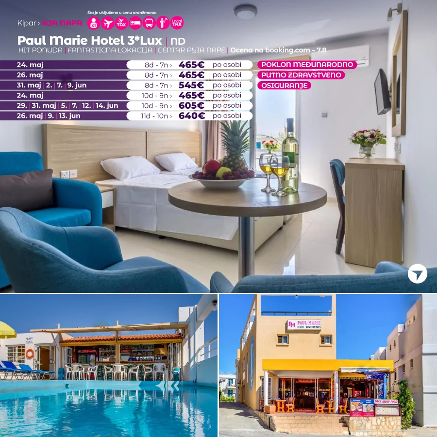 Objekat Paul Marie Hotel Apartments je smešten u centru letovališta Aja Napa i raspolaže restoranom i krovnim bazenom na otvorenom. WiFi je dostupan u zajedničkim prostorijama. Studiji i apartmani u objektu Paul Marie Hotel sadrže prostor za sedenje i balkon sa pogledom na vrt. Osim toga, imaju čajnu kuhinju sa pločama za kuvanje i posuđem. Kupatila u smeštajnim jedinicama su opremljena fenom za kosu i tušem.