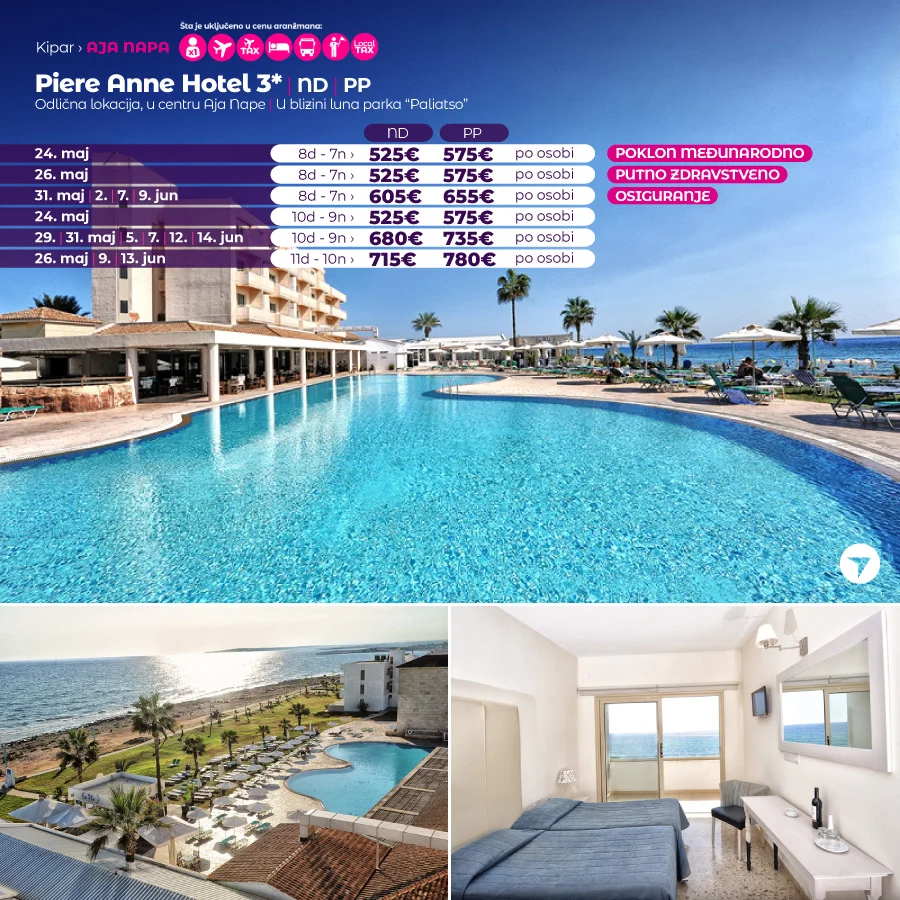 Hotel Piere Anne ima odličnu lokaciju na obali mora, na 5 minuta od centra Aja Nape i na 5 minuta od luke i plaže. Zabavni park Parko Paliatso Fun se takođe nalazi odmah iza hotela, zajedno sa čuvenom ulicom Nissi Avenue. …