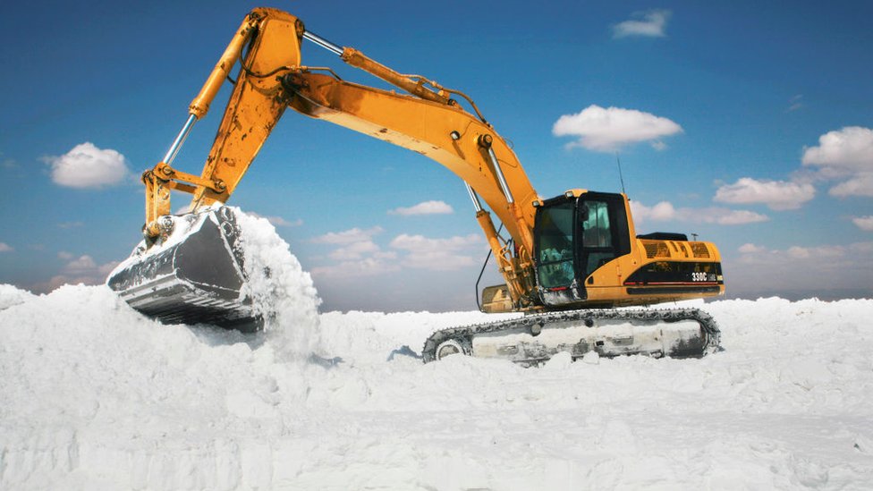 Radnici prvo buše rupe, ispumpavajući slanu vodu iz bunara duboko ispod kore soli i odlažu je u bazene za isparavanje.