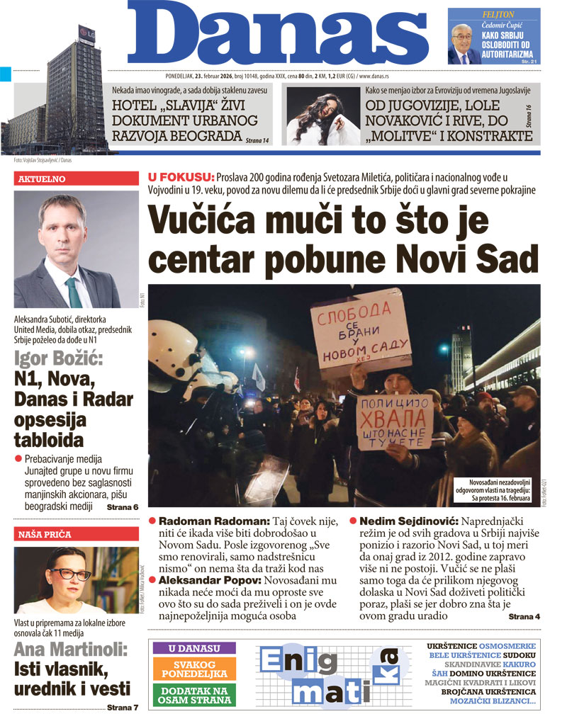 Pratite nas na našoj Facebook i Instagram stranici, ali i na X nalogu. Pretplatite se na PDF izdanje lista Danas.
