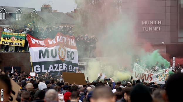 „Oslobodimo se virusa – Glejzeri napolje“, glasio je jedan od transparenata ljutih navijača Mančester Junajteda ispred Old Traforda pre nego što je oko 200 njih upalo na teren, prouzrokujući otkazivanje velikog engleskog derbija protiv Liverpula u nedelju.