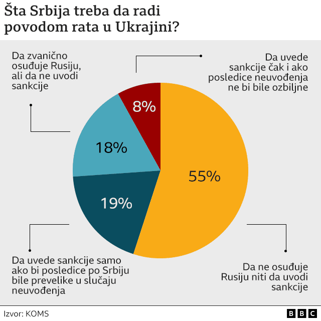 Na pitanje o ratu u Ukrajini, više od polovine njih misli da Srbija ne treba da uvede sankcije Rusiji niti osuđuje rusku invaziju.