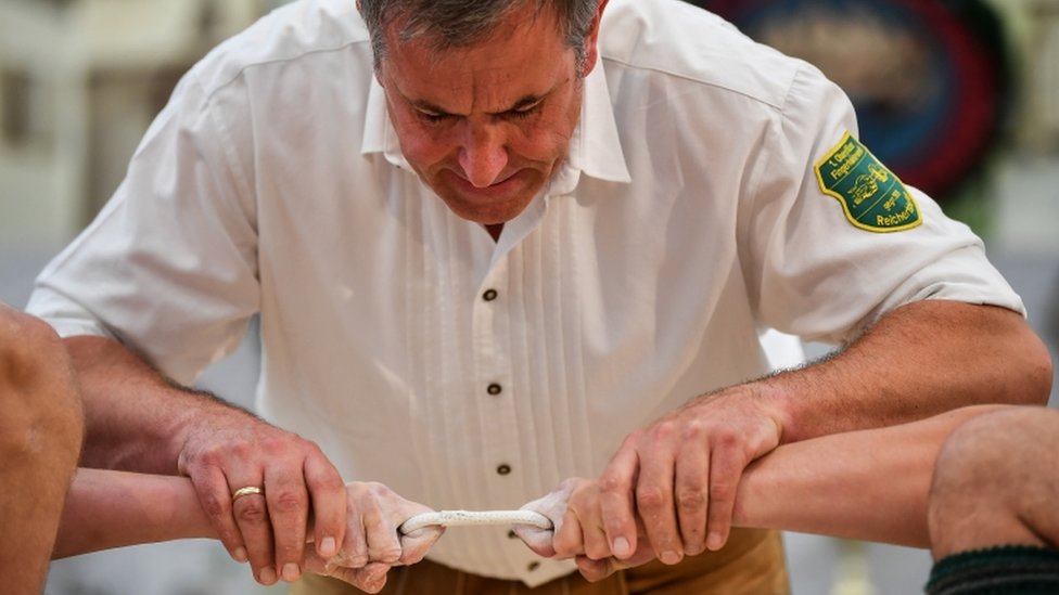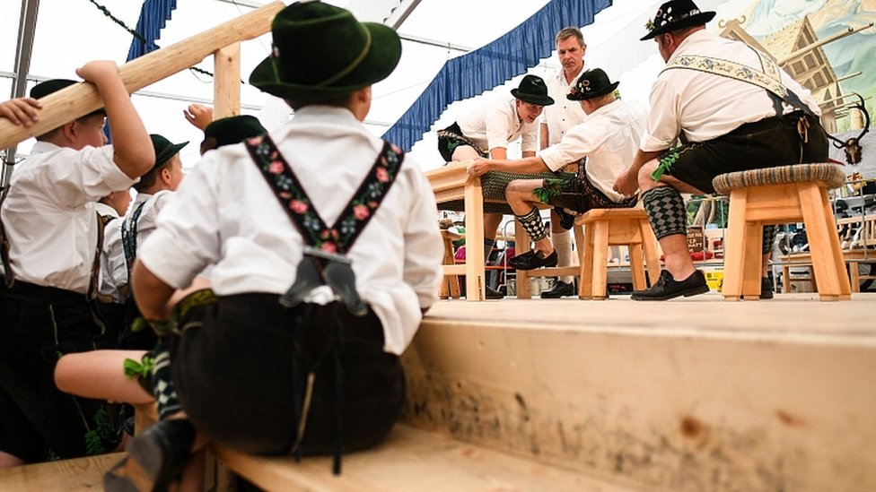 Muškarci u tradicionalnim bavarskim nošnjama seli su za stolove kako bi odmerili snage u možda najčudnijoj disciplini – nemačkom rvanju prstima (Fingerhakeln).