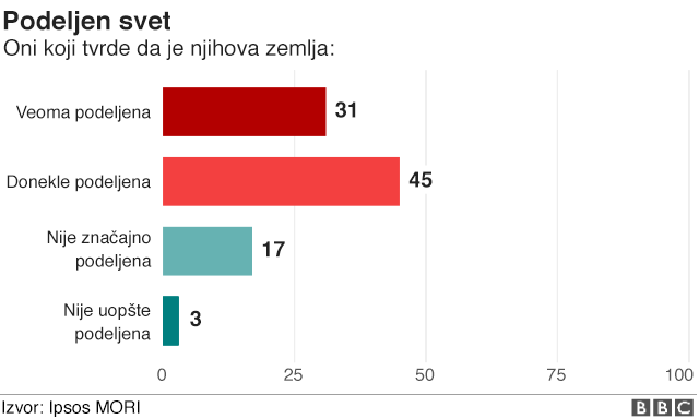 Rezultat na svetskom nivou pokazuje da je tri četvrtine ispitanika saglasno da su njihova društva podeljena, od čega jedna trećina kaže da su društva „veoma podeljena“.