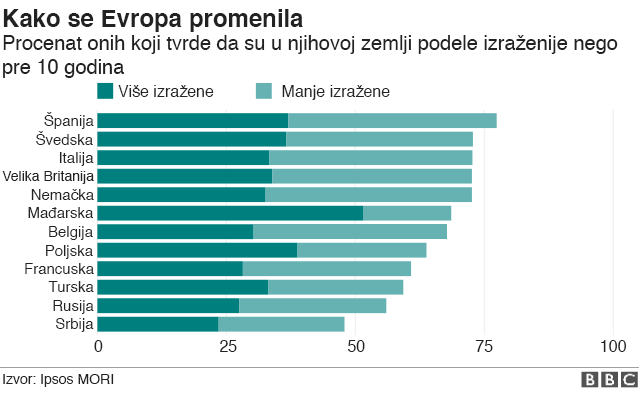 „Ovo može da bude posledica političke klime i zaokreta ka desnici kome svedočimo na delu kontinenta, ili je politička klima rezultat većih tenzija u društvima. Ove dve stvari su povezane“, kaže on.
