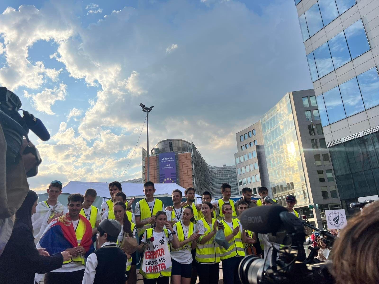 Pre nego što su ušli u zgradu evropskih institucija, studenti su na poseban način odala poštu stradalima u padu nadstrešnice novosadske železničke stanice 1. novembra 2024, što je i bio povod za proteste koji traju do danas.