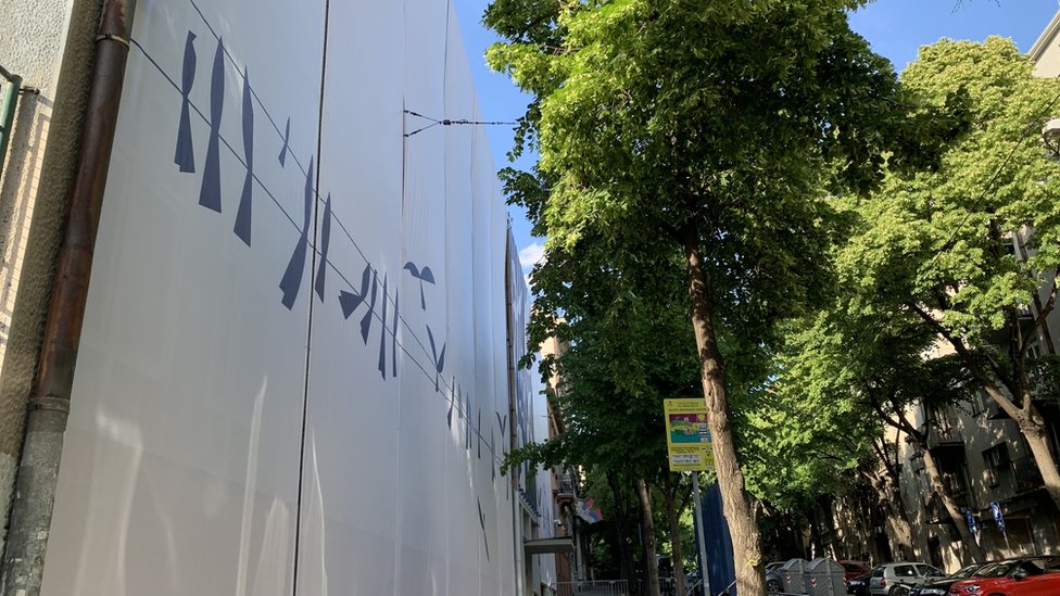 Čitavu zgradu odnedavno prekrivaju tkanine: bela sa plavim pticama na žici i plava sa pticama i zracima koji se prelamaju.