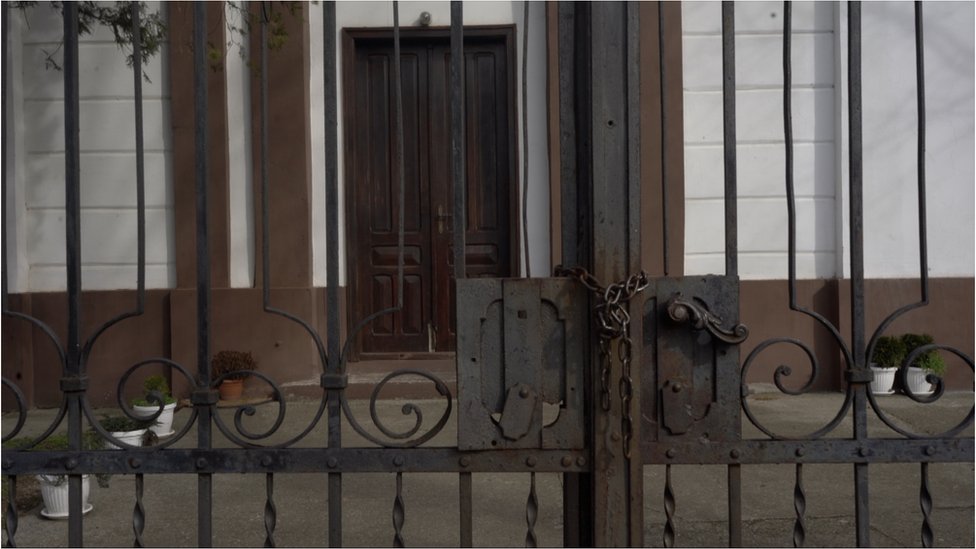 Ograda crkvenog dvorišta zaključana je katancem, a preko puta su prodavnica i škola.