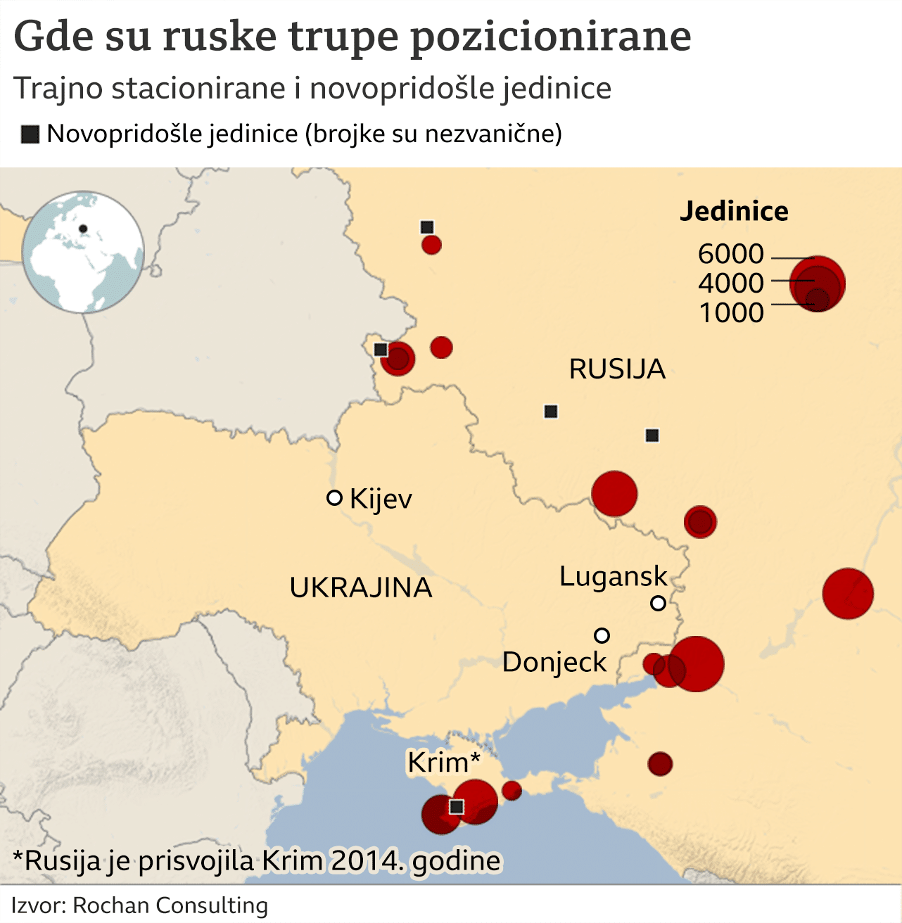 Rusija, koja optužuje Ameriku i „histeriju Zapada za rast napetosti“, poslala je na granicu 100.000 vojnika, dok NATO u odgovoru šalje dodatne ratne brodove i avione u region.