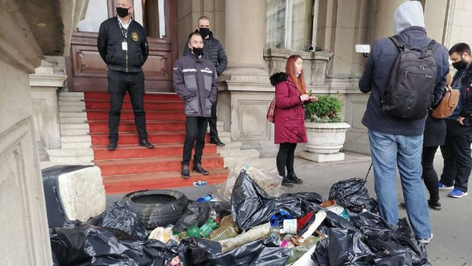 Foto: 1 od 5 milionaPokret Jedan od pet miliona saopštio je danas da su njegovi aktivisti ispred zgrade Skupštine Beograda prosuli „više desetina džakova smeća“ prikupljenog tokom akcije čišćenja Čukaričkog rukavca na Adi Ciganliji.