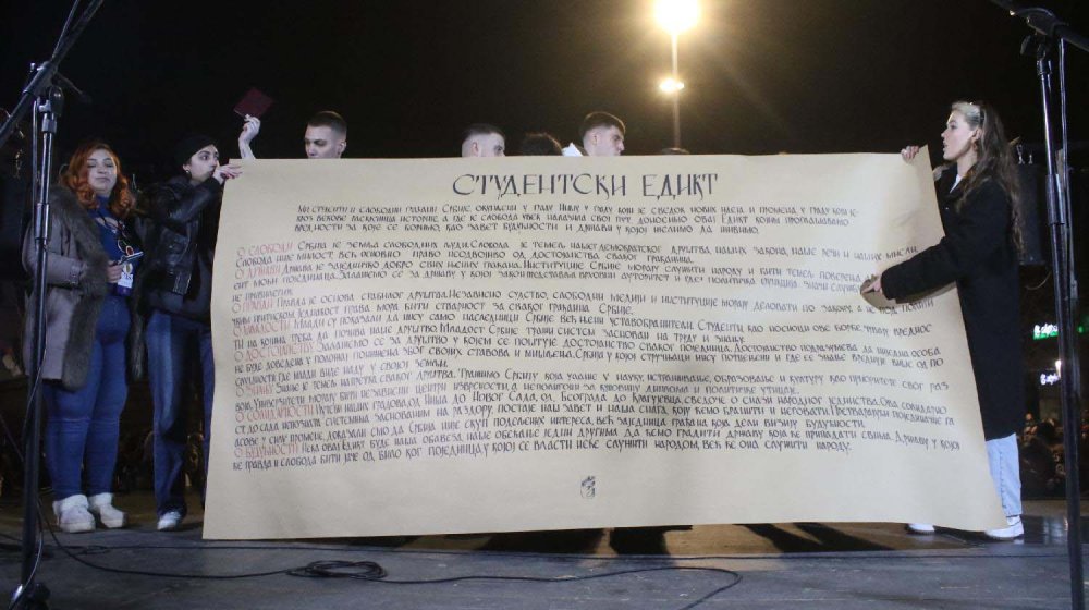 Studentki protest u Nišu: Foto FoNet Zoran MrđaU subotu, prvog marta, u Nišu je donet „Studentski edikt“, ne slučajno u gradu cara Konstantina, čiji je „Milanski edikt“ označio novu civilizacijsku eru i priznanje hrišćanstva.