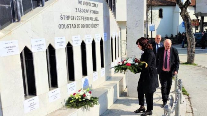 Jasmina Curić polaže venac Foto: bnv.org.rsPredsednica Bošnjačkog nacionalnog veća (BNV) Jasmina Curić, danas je položila cveće na spomen obeležje žrtvama otmice u Štrpcima u prijepoljskoj opštini.