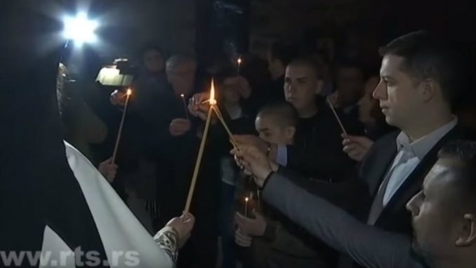 Foto: RTSPonoćnoj liturgiji u manastiru Banjska kod Zvečana prisustvovalo je više stotina vernika među kojima i šef vladine Kancelarije za KiM Marko Đurić.