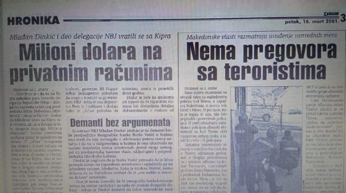 “Definitivno je utvrđeno da je obavljena makar jedna nelegalna finansijska transakcija vredna više miliona dolara – izjavio je guverner Narodne banke Jugoslavije Mlađan Dinkić po povratku sa Kipra delegacije NBJ koja je tamo otputovala na poziv kiparskih zvaničnika da utvrdi činjenice o postojanju nelegalnih novčanih transakcija”, stoji u tadašnjem tekstu Danasa.