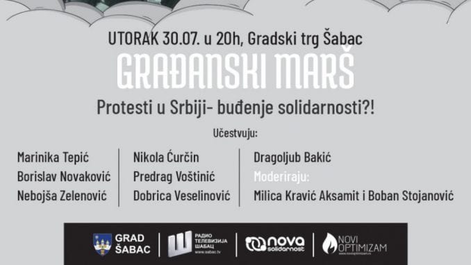 Foto: Novi OptimizamVišednevni društveno angažovani program u Šapcu, pod nazivom „Zona novog optimizma“, biće nastavljen večeras u tom gradu tribinom „Građanski marš“, posvećenom protestima u Srbiji.