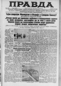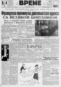 Foto: Matea Milošević/Univerzitetska biblioteka "Svetozar Marković"Pre tačno 80 godina list Vreme na naslovnoj strani pisao je o prekidu diplomatskih odnosa Francuske i Velike Britanije, dok je list Pravda izvestio o tajnom sporazumu Francuske i Italije o Sueckom kanalu.