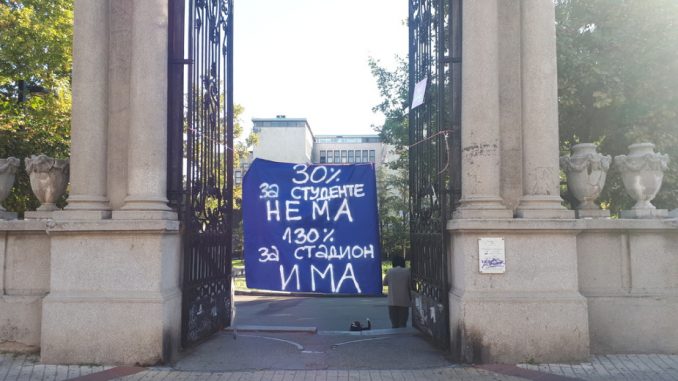 Transparent ispred Studentskog parka Foto: Tim Kreni-PromeniNovi protest studenata pod nazivom „Za stadione ima, za studente nema“ zakazan je za subotu 3. oktobar, od 18 časova, ispred Rektorata, najavljeno je večeras iz Tima Kreni-Promeni. Studenti će zatim prošetati do ministarstva prosvete i tehnološkog razvoja.