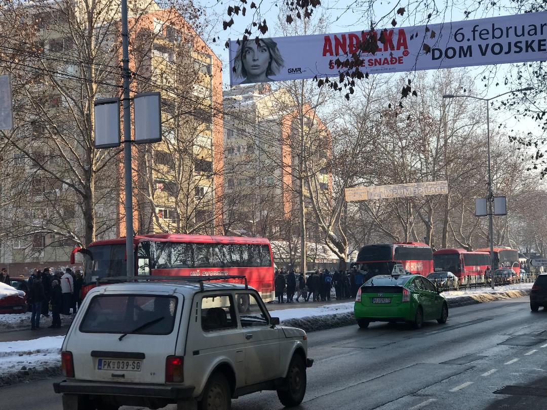 Izveštači na izlazu iz grada, gde se „slila“ većina autobusa koji su krenuli za Beograd izbrojali su manje od 20 autobusa. Imena putnika su prozivana po spiskovima, a oni su dobijali sendiče i vodu. Na autobusima nije bilo stranačkih obeležja, već su bili “obeleženi“ fotografijama Putina i predsednika Srbije i SNS-a Aleksandra Vučića. Prema nezvaničnim informacijama, autobusi su kretali sa punktova kod Tempa, sportske hale „Čair“, takozvane „Šivare“,Pravnog fakulteta, tržnog centra „Zona 3“, Benetona, naselja Delijski vis i Crni put, kao i okolnih sela.