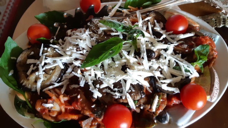 5. Testeninu stavite u tanjir i na vrh okrugle kriške patlidžana i krupno naribanu slanu rikotu, naravno i par listova bosiljka.