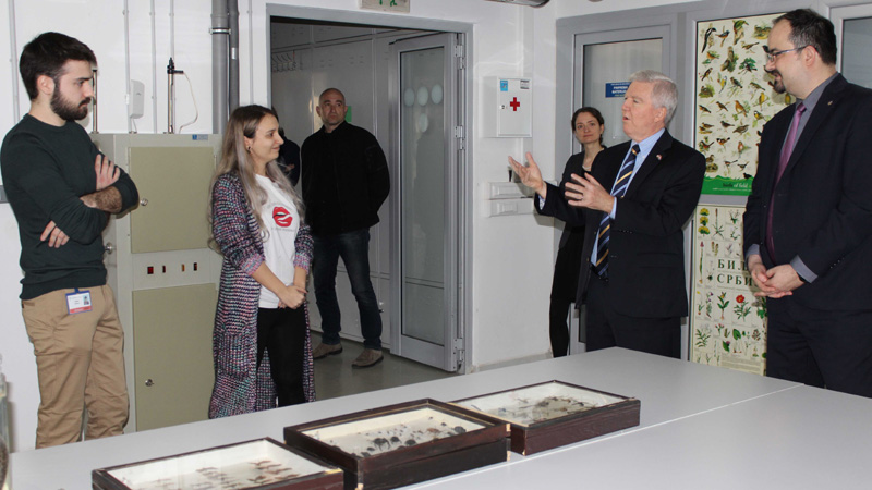 Ambasador Skat je obišao moderne laboratorije Istraživačke stanice Petnica i razgovarao sa rukovodiocima programa, predavačima i mentorima, ali i studentima saradnicima koji kao vršnjački edukatori pomažu u realizaciji obrazovnih programa ove prestižne evropske institucije za dodatni rad sa mladima.