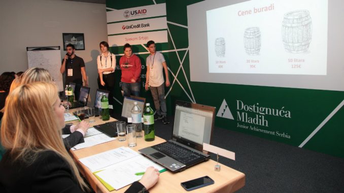 U ponedeljak je učenicima dat “izazov” da razviju poslovnu ideju koja bi spojila stare srpske zanate i modernu tehnologiju. Uz pomoć biznis volontera iz UniCredit banke, učenički timovi osmišljavali su rešenje problema i kreirali biznis planove i prezentacije koju su u utorak predstavili članovima žirija i publici.