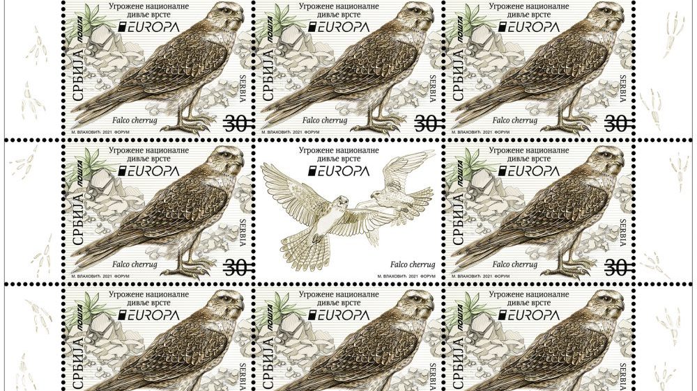 Prigodno izdanje EVROPA Pošte Srbije–Ugrožene nacionalne divlje vrste, sa dve marke u tabacima od osam maraka sa vinjetom u sredini, jednim prigodnim kovertom prvog dana i prigodnim žigom, izlazi 12. maja, i ima za motive strogo zaštićene vrste kod nas – stepskog sokola (Falco cherrug) i ušatu ševu (Eremophila alpestris).