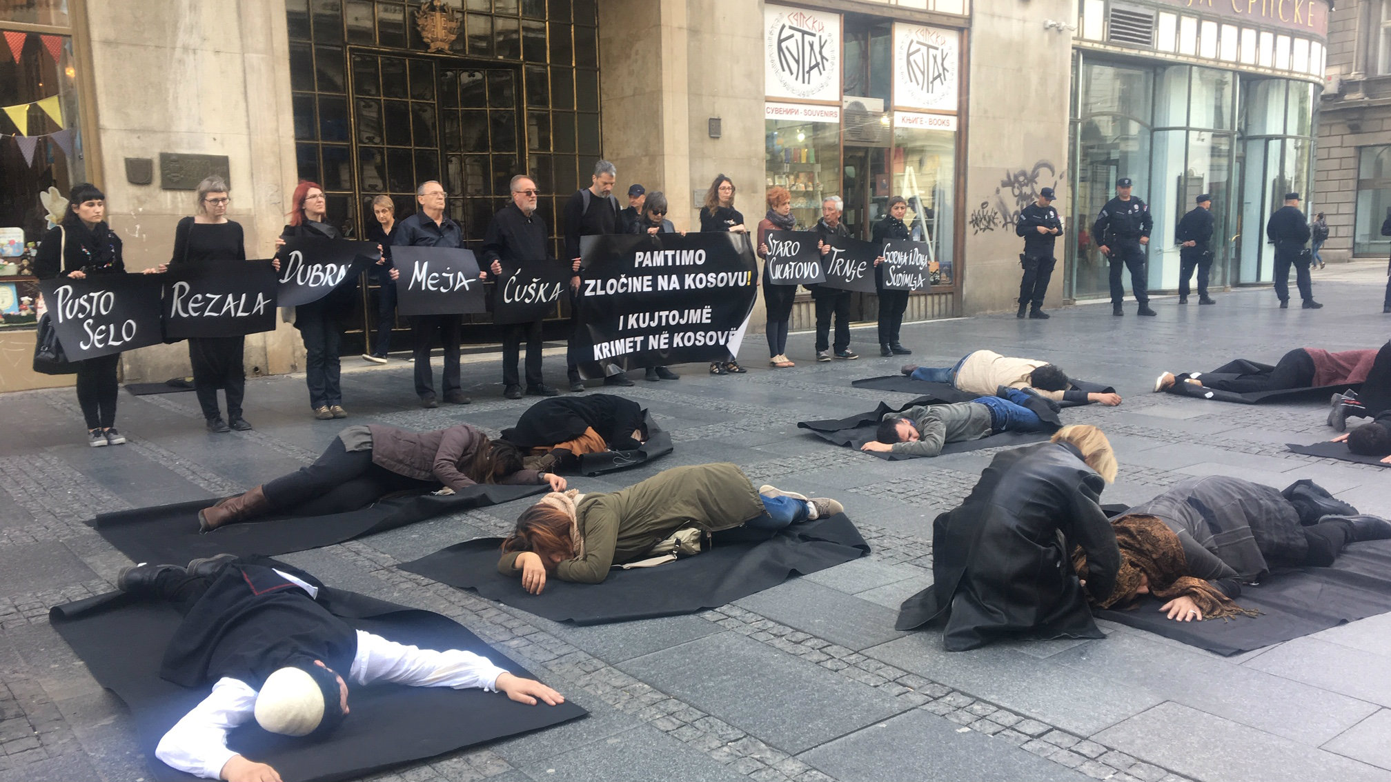 Na transparentima su bila ispisana imena mesta u kojima su počinjeni zločini, poput Ćuške, Dubrave, Trnja… Na najvećem transparentu je pisalo “Pamtimo zločine na Kosovu” na srpskom i albanskom jeziku. Na pločniku su stavili prostirke na kojima su ležali “mrtvi” Albanci i oko njih ocrtavali njihova tela kredama.