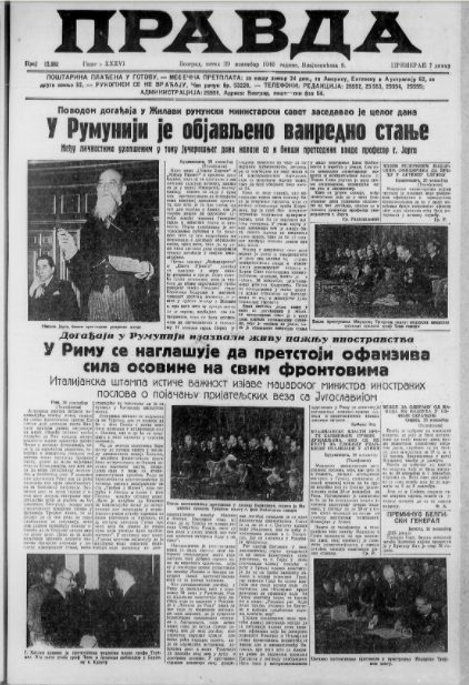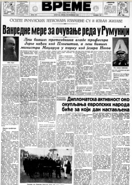 Foto: Nataša Matović / Univerzitetska bibliotekaNa današnji dan pre 80 godina list Vreme pisao je o vanrednom stanju koje je proglašeno u Rumuniji uoči otkrića beživotnih tela nekoliko nekadašnjih rumunskih zvaničnika, dok se u listu Pravda mogao pročitati tekst o fudbalskom derbiju između Beograda i Zagreba koji se simbolično igrao na dan ujedinjenja.