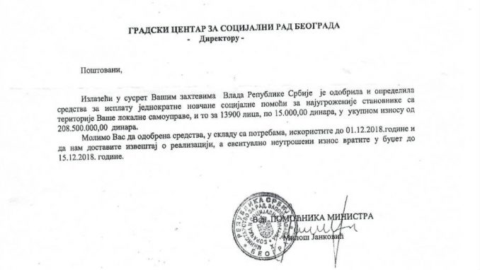 Bez obzira ko je određivao kriterijume za raspodelu novca, prema saznanjima Danasa, Centar za socijalni rad je podelio 208,5 miliona dinara sigurnim glasačima Srpske napredne stranke pred beogradske izbore. Sredstva od po 15.000 dinara dobilo je 13.900 ljudi iz opština Obrenovac, Barajevo, Vračar, Grocka, Sopot i Lazarevac.