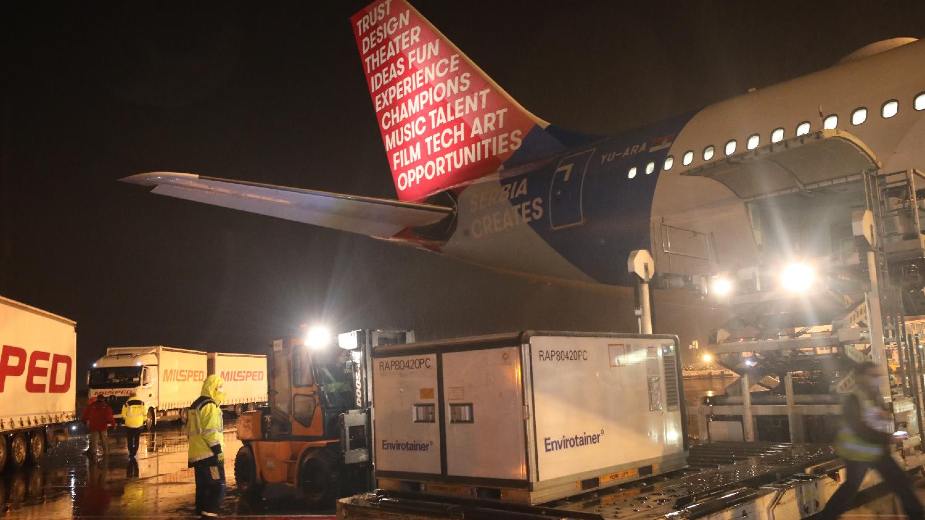 Premijerka Srbije Ana Brnabić je sa ambasadorkom Kine Čen Bo dočekala pošiljku iz Kine na aerodromu Nikola Tesla u Beogradu.