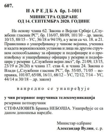 U Službenom vojnom listu objavljena je naredba kojom Vulin vanredno unapređuje Nebojšu Stefanovića u čin rezervnog poručnika telekomunikacija, prenosi N1.