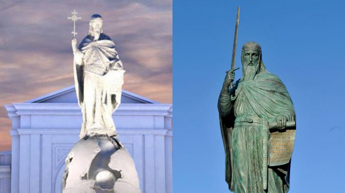 Foto: (1)N1 (2)BETAPHOTO/BEOINFO/EVOd početka pogrešno formulisan, spomenik Stefanu Nemanji sada „krasi“ nova nedoslednost. Umesto krsta u ruci, kako je prvobitno predstavljeno javnosti na ilustraciji pobedničkog rešenja, sada „vitla“ mačem.