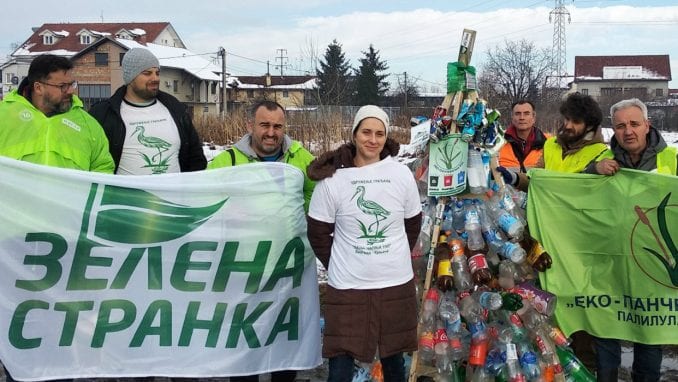 Zelena stranka postavila je danas na Zrenjaninskom putu, kod supermarketa Roda na Novom Beogradu, novogodišnju jelku okićenu smećem.