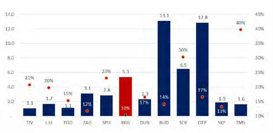 Na primer budimpeštanski aerodrom, kroz koji je prošle godine prošlo 13,1 miliona putnika, imao je rast od 14 odsto. Aerodrom u Bukureštu prevezao je 12,8 miliona putnika uz još veću stopu rasta od 17 odsto. Aerodrom najpribližniji beogradskom po kapacitetu, sofijski aerodrom, prošlu godinu završio je sa 6,5 miliona putnika i rastom od čak 30 odsto.