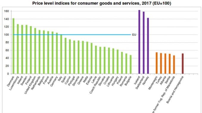 Najviše cene u Evropskoj Uniji su u Danskoj, Luksemburgu, Irskoj i Švedskoj, Finskoj i Velikoj Britaniji. Još skuplje robu i usluge plaćaju stanovnici Islanda – 166 odsto, za kojima slede Švajcarci sa 159 odsto proseka EU i Norvežani sa 143 odsto, prenosi Eurostat.
