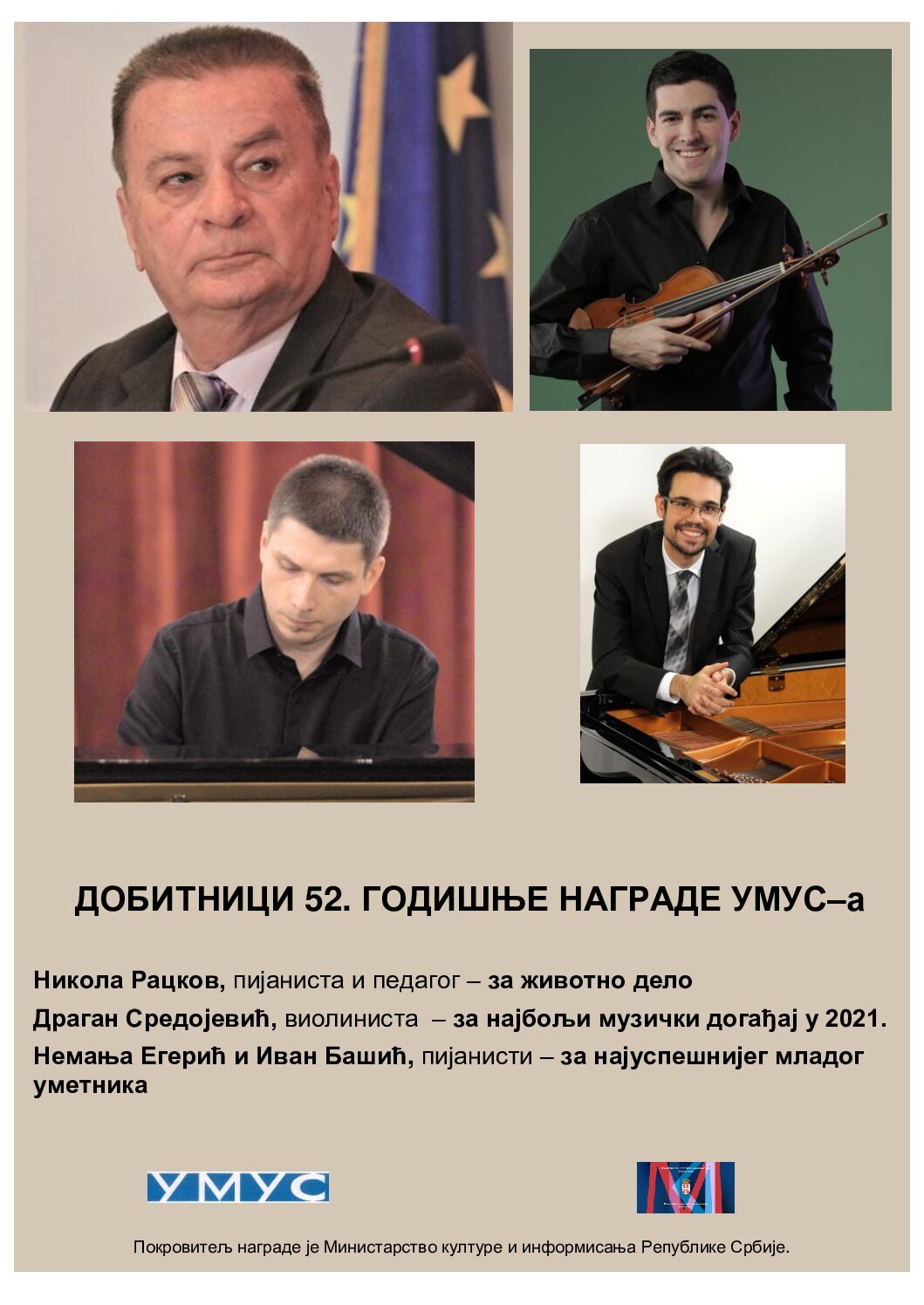 Nakon dvogodišnje pauze usled epidemije kovida, Udruženje muzičkih umetnika Srbije dodelilo je danas povelje – diplome laureatima, dobitnicima najvišeg priznanja UMUS-a u oblasti solističke muzičke interpretacije umetničke muzike.