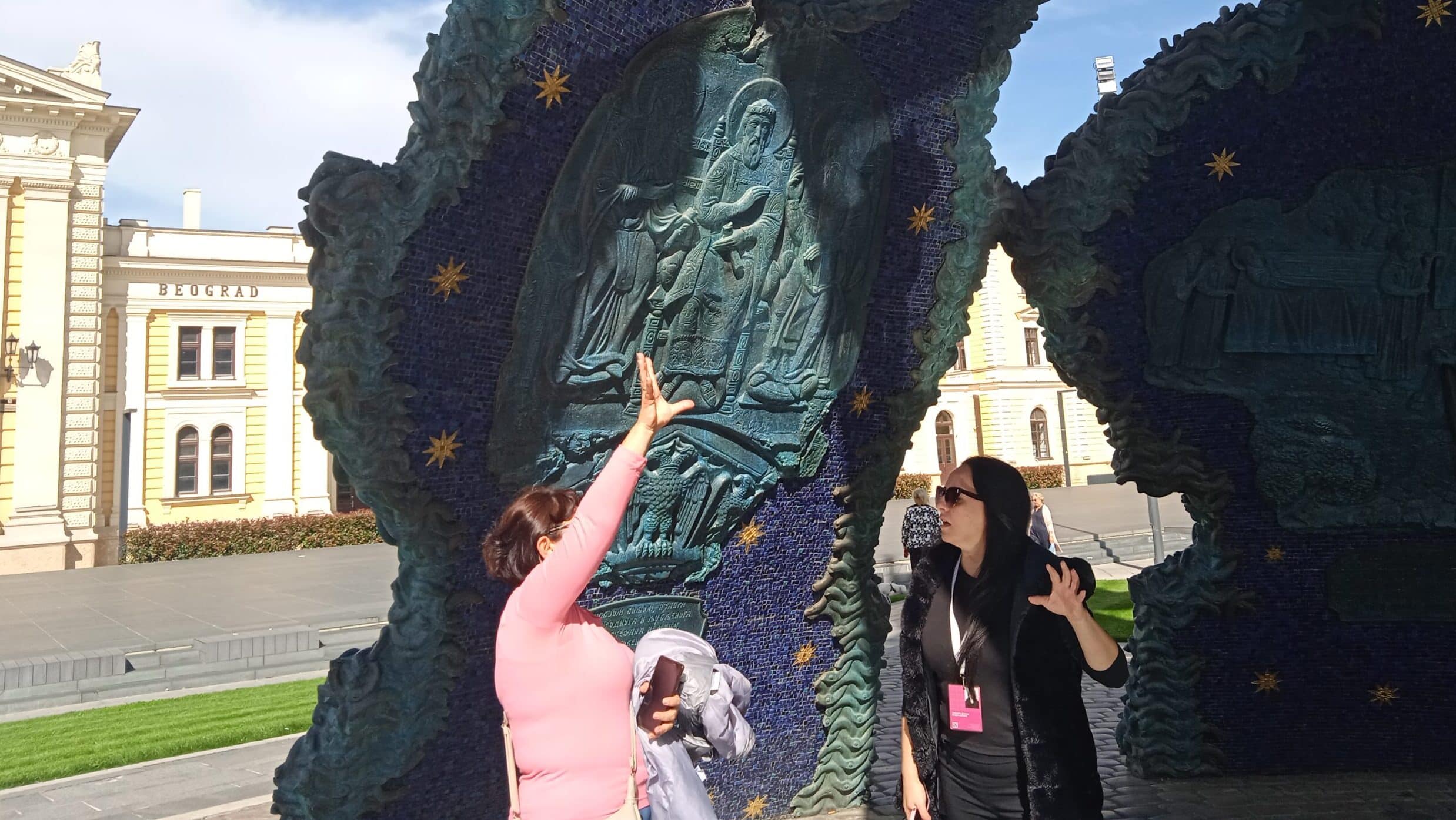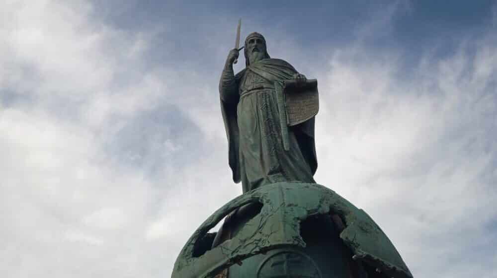 To kaže naša ljubazna voditeljka u sklopu stručnog vođenja Muzeja grada Beograda, organizovanog u sklopu Dana evropske baštine, koje bi zainteresovane trebalo da upozna s obnovljenim delom grada i, naravno, omnipotentnim kipom što ovde dominira. Nema veze ako vam je isprva delovao kao džin iz Kinder jajeta, ni ako vas takozvani simbol „tvorca moćne srpske srednjovekovne države” plaši kad pogledate uvis zbog mača kojim preti odozgo. Sve to može da zagladi jedna fino spakovana priča.
