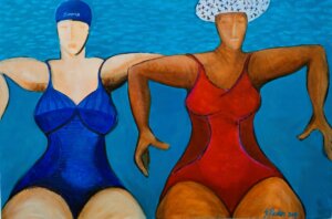 „Kupačice“ su, kako navodi Radan, nastale pre nekoliko godina, a inspiracija je krenula od bazena i žena sa telima različitih boja i oblika koje žele da zadrže mladost i svežinu, da bi se 2021. u vreme pandemije ovaj motiv „uselio“ u njen londonski atelje.
