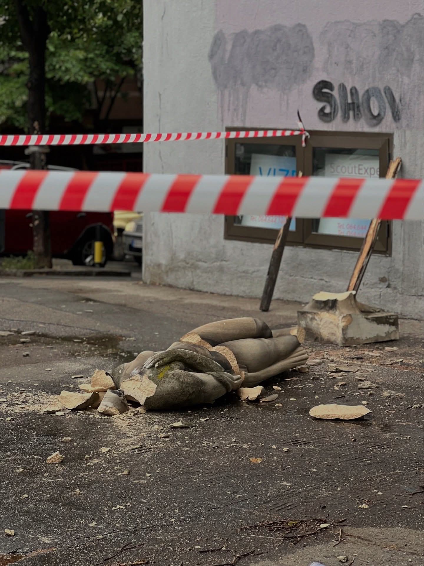 Nadležni nisu reagovali ni sada kada je skulptura pala, niko nje o tome napravio zapisnik, pa je ona sada smeštena u dvorištu zgrade iako vrata na ulazu, kao i interfon ne rade.