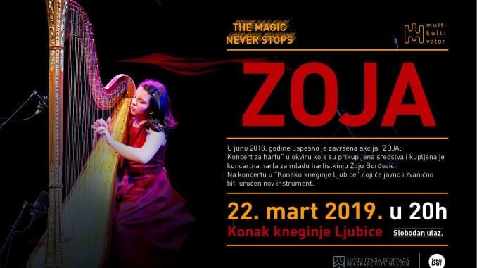 Multikultivator u saradnji sa Muzejom grada Beograda predstavlja koncert mlade harfistkinje Zoje Đorđević, koji će biti održan u Konaku kneginje Ljubice u petak 22. marta u 20h. Ulaz je slobodan.
