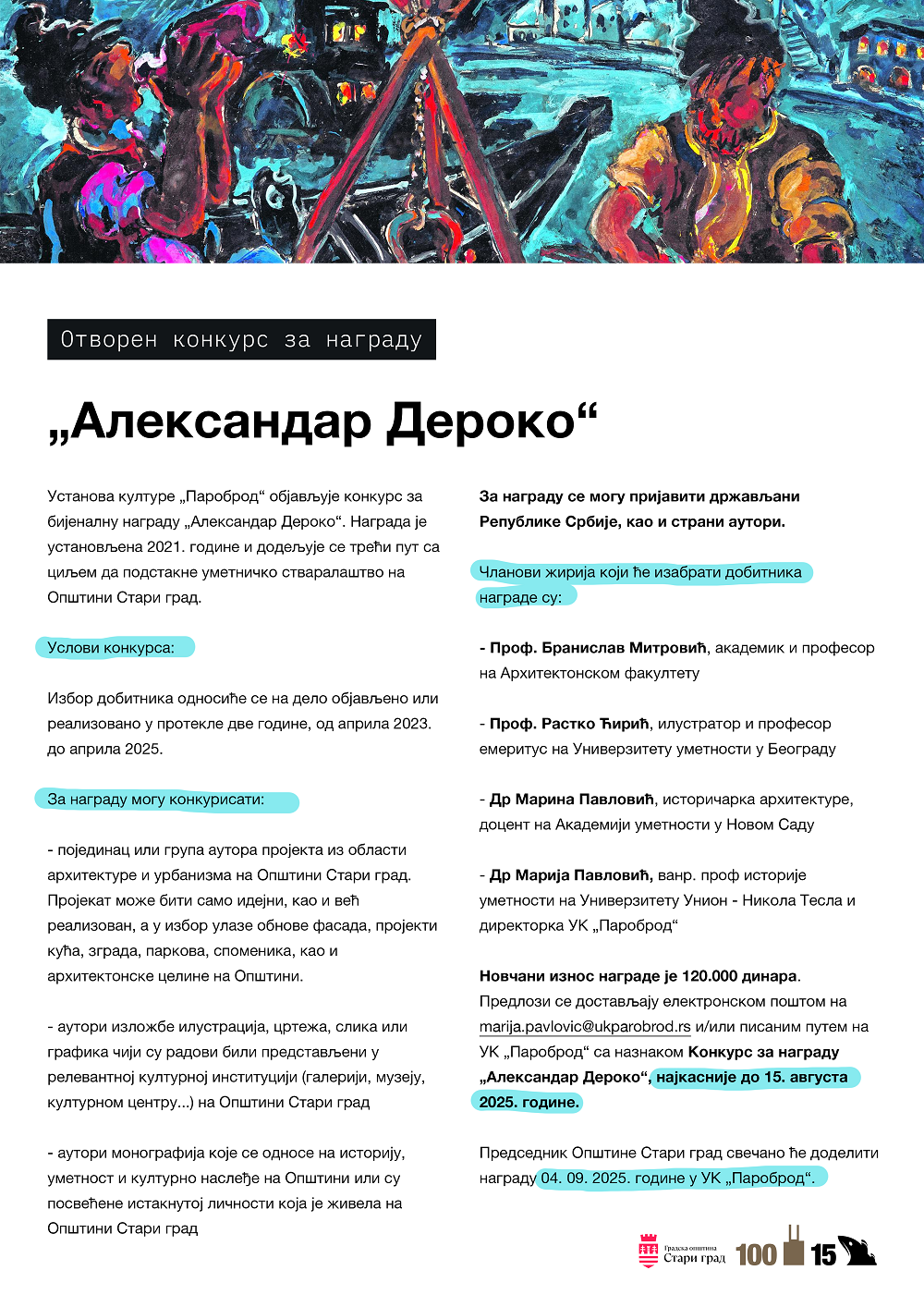 Predlozi se dostavljaju elektronskom poštom na [email protected] i/ili pisanim putem na UK „Parobrod“ sa naznakom Konkurs za nagradu „Aleksandar Deroko“, najkasnije do 15. avgusta 2025. godine.