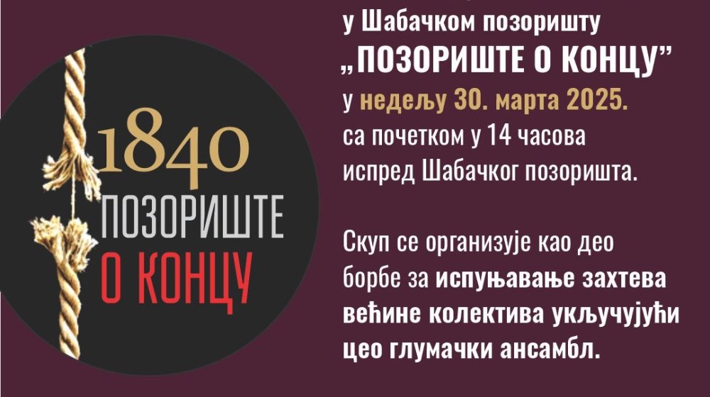 Foto: Pobunjeni u Šabačkom pozorištu Skup Pozorište o koncu, biće održan danas u nedelju 30. marta sa početkom u 14 časova, u organizaciji sindikata NEZAVISNOST – kod poslodavca „Šabačko pozorište“.