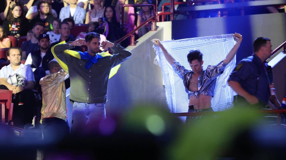 Dok je nastupala predstavnica Izraela, dvojica muškaraca podigla su zabranjena propalestinska obiležja – zastavu i maramu popularno zvanu „palestinka“. Obezbeđenje im je odmah oduzelo simbole i ispratilo ih iz dvorane.