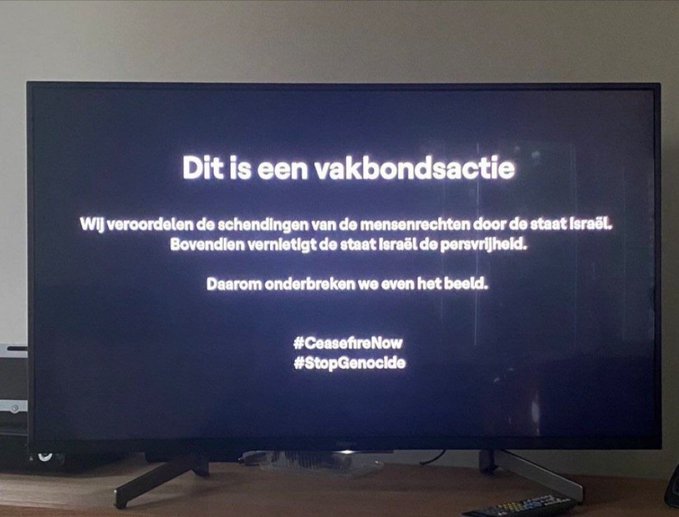 „Ovo je sindikalna akcija. Osuđujemo kršenja ljudskih prava koja je počinio Izrael. Nadalje, Izrael uništava slobodu štampe. Zbog toga prekidamo program na trenutak“, vidi se na ekranu, piše Index. hr