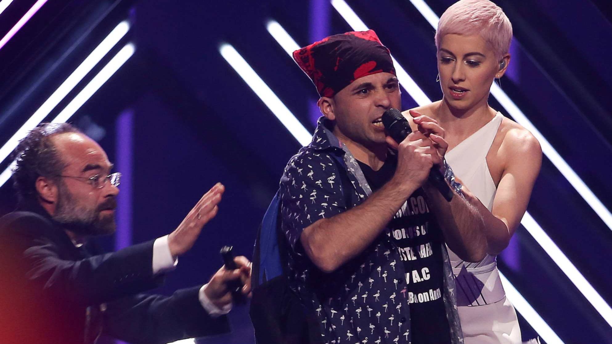 Finale 63. Evrovizije u Lisabonu obeležio je incident tokom nastupa britanske pevačice SuRie, kada je na binu upao muškarac i pevačici oteo mikrofon, nakon čega je odmah reagovalo obezbeđenje.